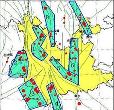 地震学上,将历史上发生过6—7级以上地震的地区叫做地震带(区)。按照这个划分,云南省主要分为7个地震带,包括小江地震带,中甸—南涧地震带,大关—马边地震带,澜沧—耿马地震带,泸水—腾冲地震带,普洱—宁洱地震带,通海—石屏地震带。其中地震活动最频繁,历史上强震发生次数最多的是小江地震带。小江地震带北起巧家连接东川、寻甸、嵩明向南直到个旧一带,南北长500公里,东西宽70—80公里。历史上曾发生6—6.9级地震10次,7级以上强震4次,最大的为1833年发生的嵩明杨林8级地震,这也是云南省历史上发生过的最强地震。这次地震造成嵩明、河阳(今澄江)、宜良等十州县严重受灾,死亡6707人,受灾人口达153385人。