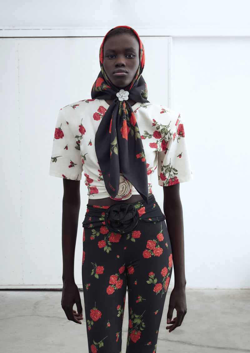 MAGDA BUTRYM H&M短款 T 卹,採用柔软、有玫瑰图案棉质针织布料。罗纹领口、可拆式肩垫、腰部前部有褶皱细节和贴花。图案和贴花均採用设计师标誌性的玫瑰图案。同款这里上官网