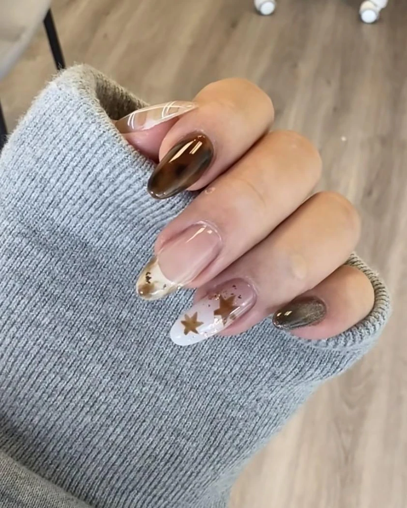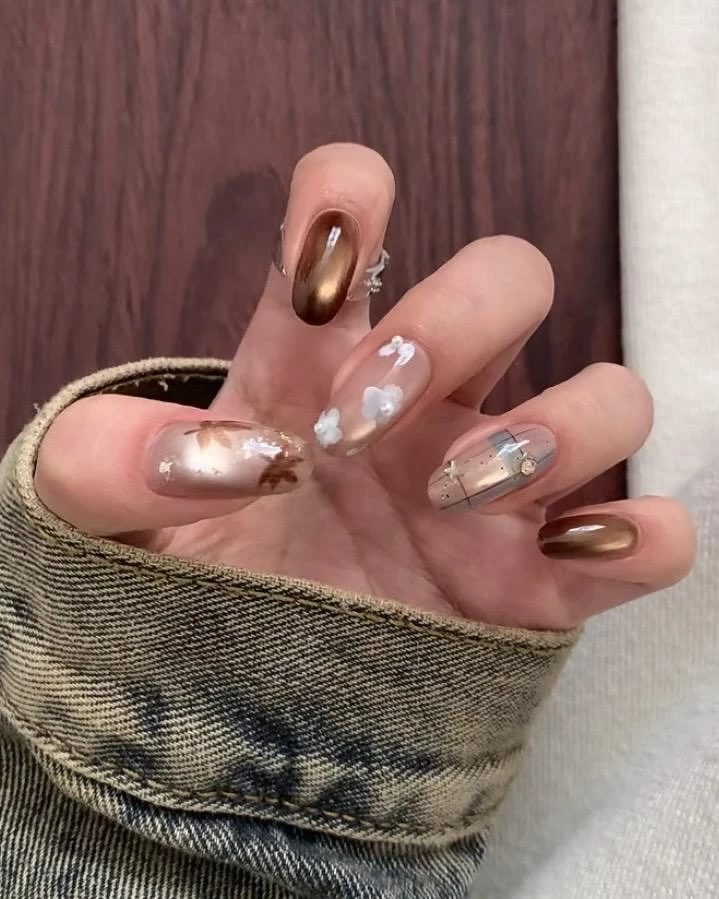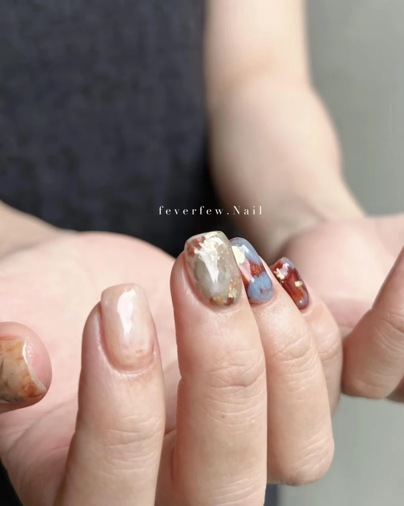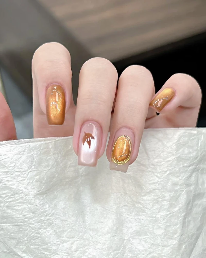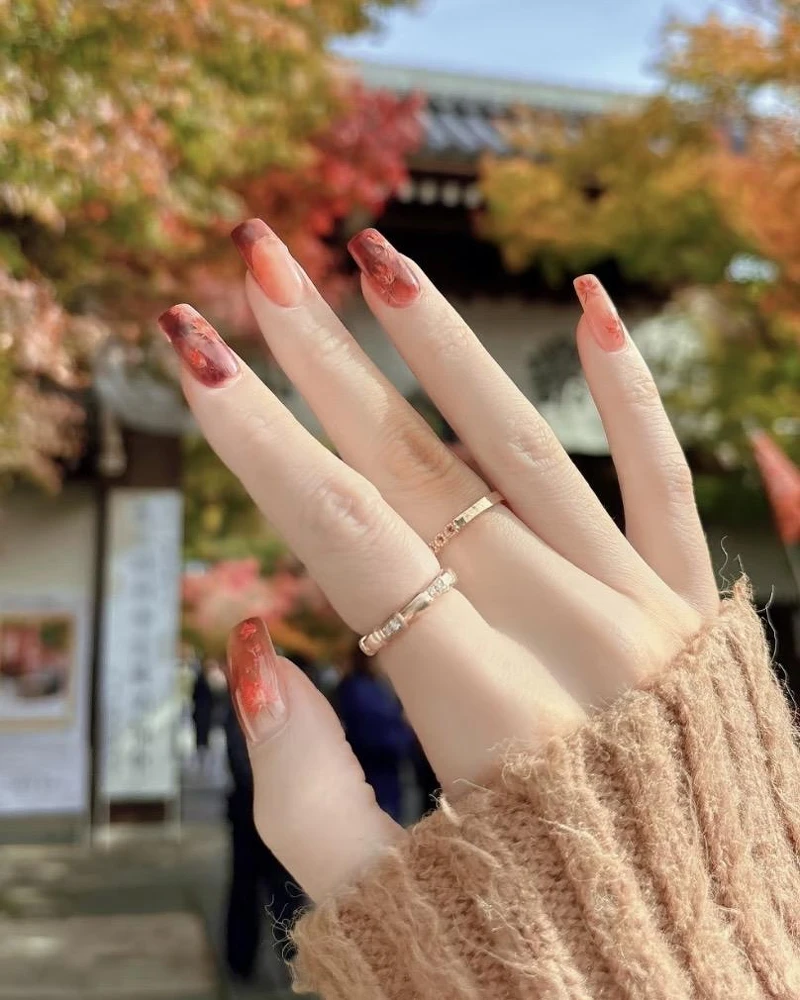 想让手部多一点光泽感与通透氛围,琥珀光晕款就是亮点。以橙红、棕色和琥珀色晕染交错,最后再加上一层细闪或玻璃纸质感,指尖就像透过阳光的枫叶,晶莹又带着微微流光。这款美甲很适合喜欢仙气与浪漫氛围的女孩,最适合拍美照。