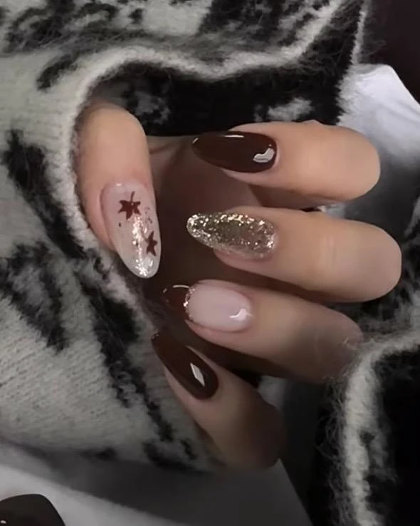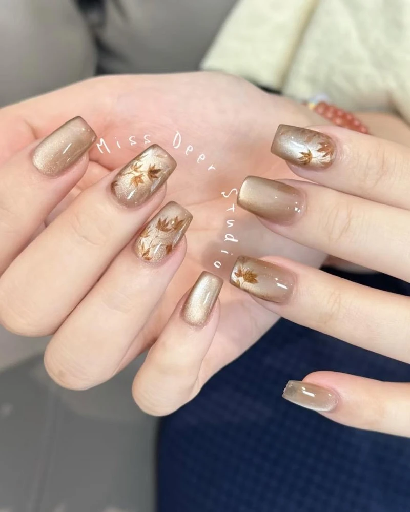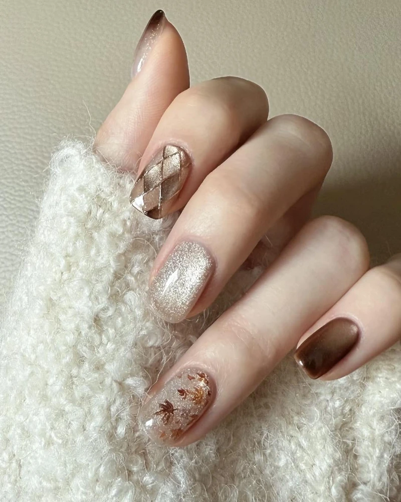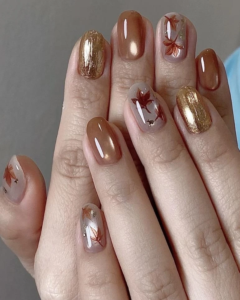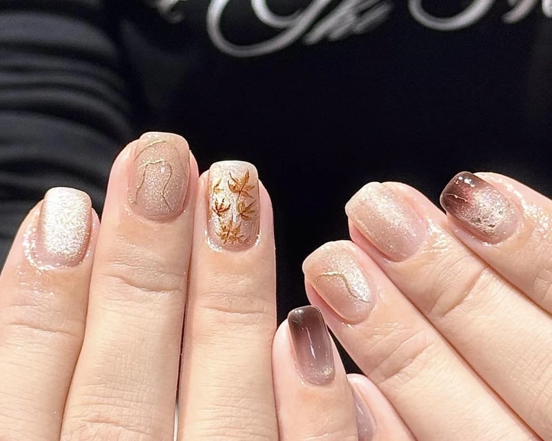枫叶美甲的最大魅力,在于它能把秋天的色彩浓缩在指尖。红棕色系是最经典的选择,像是刚落下的乾燥枫叶,温柔又带有一点复古感。若想要更具层次感,可以尝试晕染渐层,让橙黄到红棕的过渡色彩自然晕开,宛如一片片真实枫叶在手上绽放。再搭配少量金属元素点缀,例如金箔或亮片,立刻营造出阳光照耀下闪烁的质感。