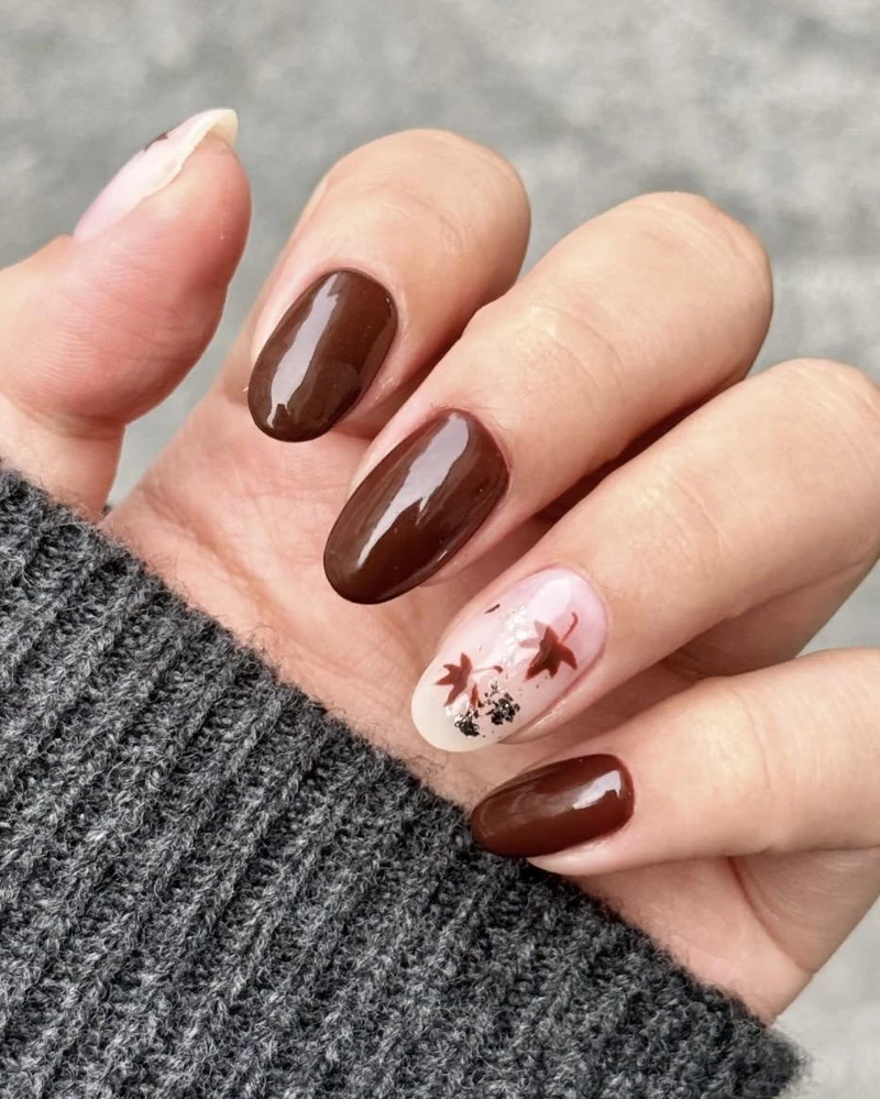 如果你喜欢低调又带点小心思的设计,手绘枫叶就是最佳选择!以透明或裸色作为底色,再在其中一两指勾勒细緻的枫叶线条,这种设计不会过于抢眼,却能在举手投足间展现优雅细节,最适合上班、上课或日常约会。
