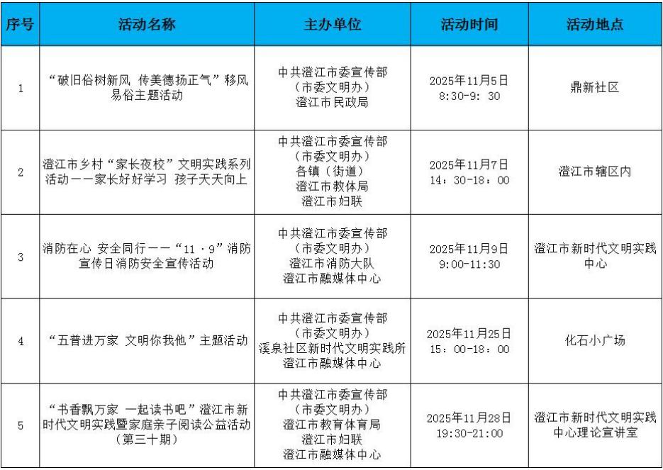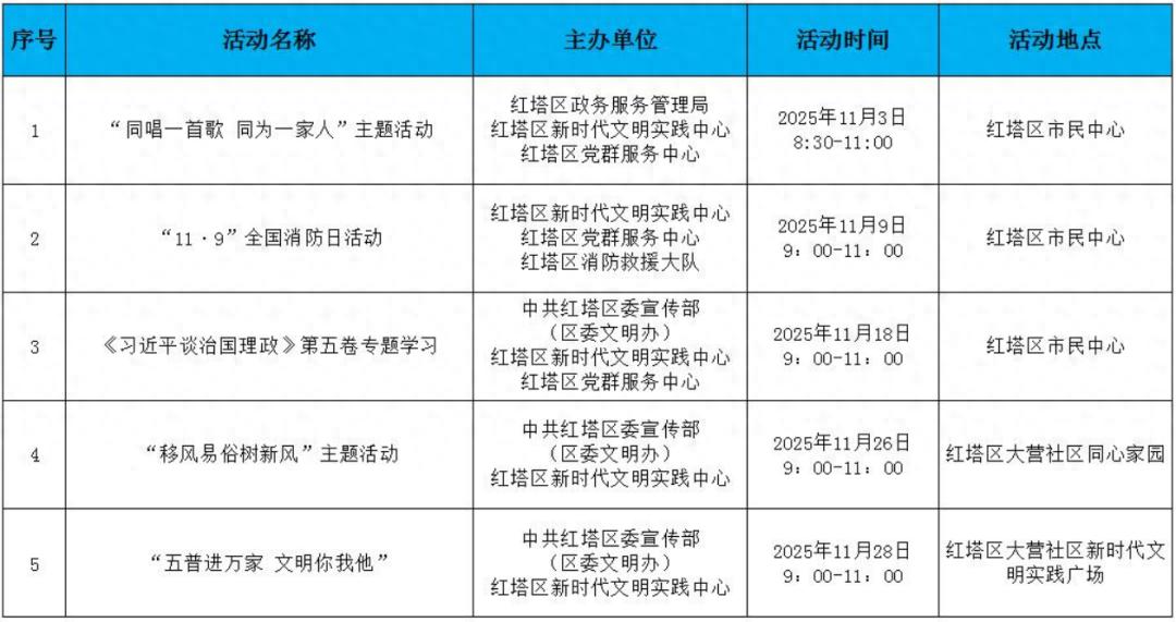 为进一步深化和推进“文明玉溪”建设,玉溪市委宣传部面向全市发布玉溪市2025年11月新时代文明实践活动,旨在激发全市人民的热情,共同投身于文明实践中。诚挚广大群众积极踊跃参与“五普进万家 文明你我他”“11·8”中国记者节、“11·9”全国消防日、乡村“家长夜校”等主题活动,共同弘扬时代新风,奏响文明之歌!期待您的参与!